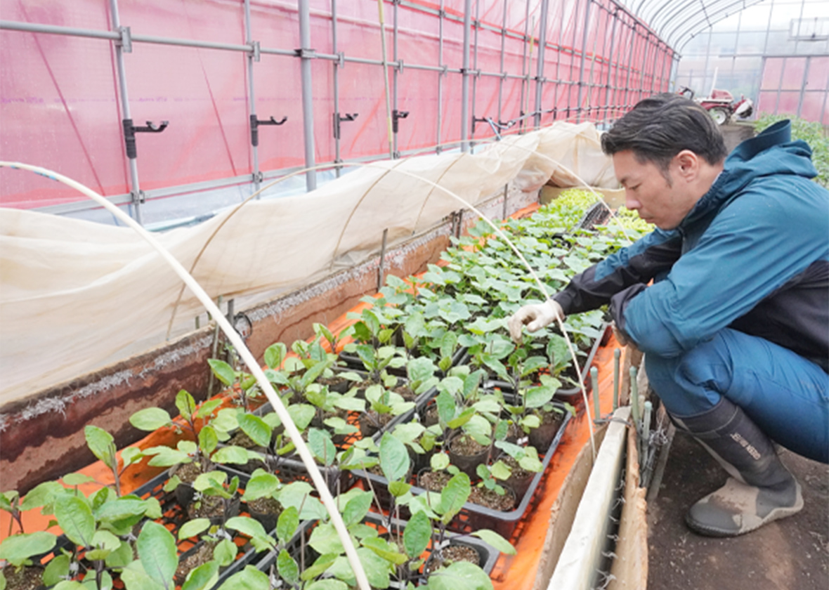 穏やかな笑顔を浮かべ子どもの頃を思い出すのは、砧地区で農業を営む城田恭宏さん。ハウスを含めた約10aの畑を切り盛りし、この時期はトマト・ナス・キュウリ・エダマメ・レタス・イモ類などを栽培しています。日課となっている作業は苗への水やり・朝晩のハウス開け閉め・土壌の酸度調整などで、特に農作業のスタートとなるこの時期は元気な苗の育成に力を入れているそうです。