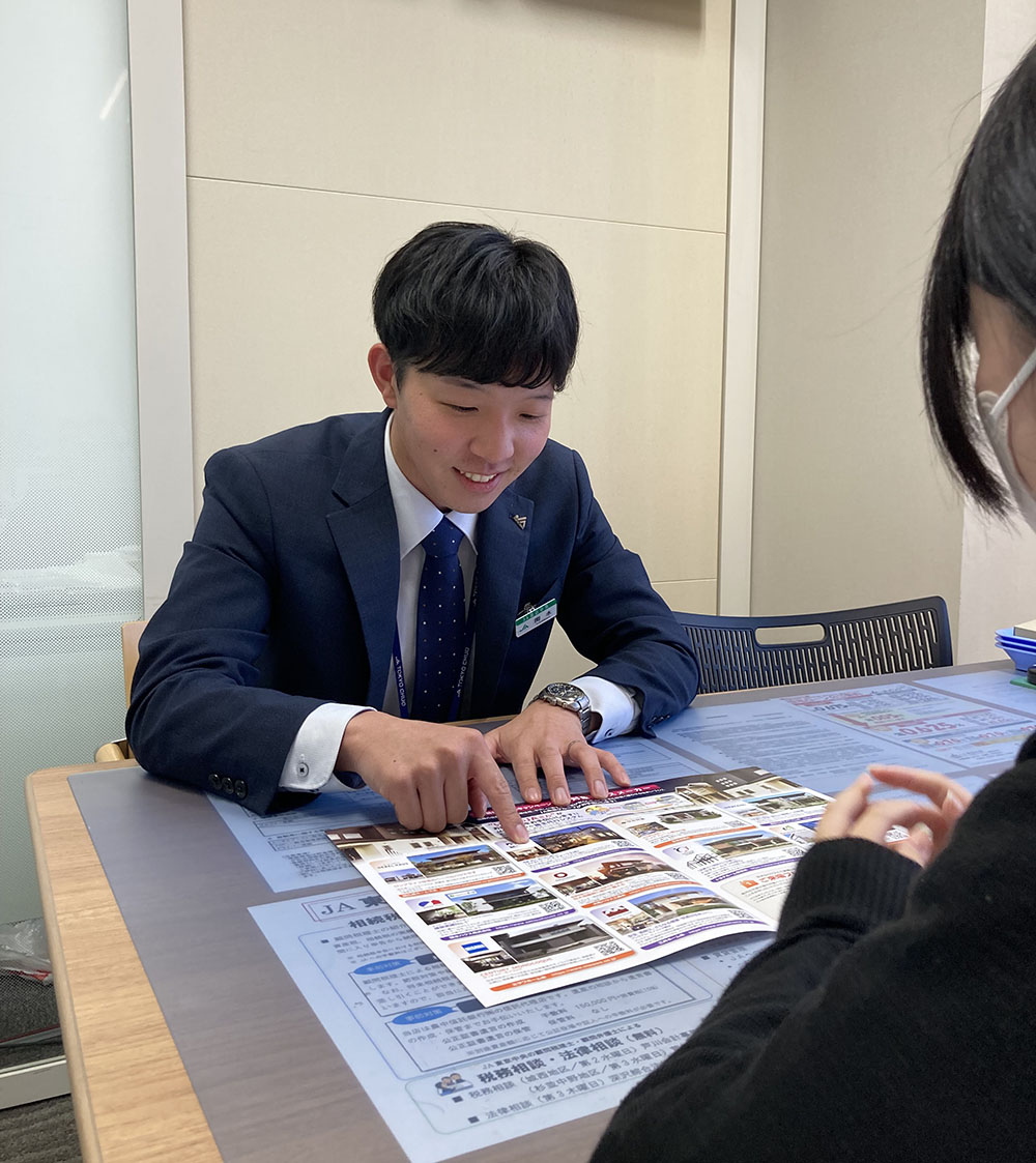 現在は資産管理課として組合員の相続、建築、土地活用や税務など幅広く資産の保全・継承に携わっています。専門的な知識や資格等も必要になるため、慣れるまでは大変でしたが、先輩たちにフォローしていただきながら組合員の為に尽力でき、また貴重な経験を積める業務にやりがいを感じています。今の職場は風通しが良く、何でも相談できる環境でとても働きやすいです。